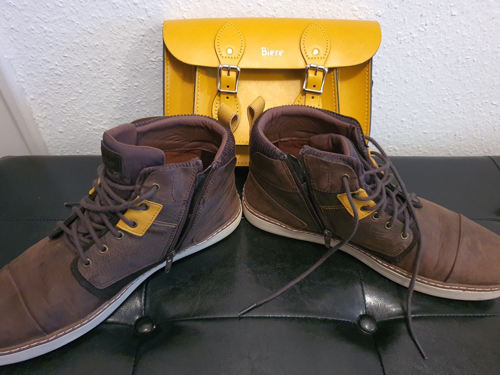 The answer is obvious if you are as “metro” as I pretend to be: the shoes match the purse. I have giant feet. They say that guys with big feet … have to buy big shoes. That can be an issue in Europe. Size 14 US translates to about a 48 in Europe and the largest standard size here is about a 46 (12.5 US). Sometimes I can find larger shoes in Germany and I like buying German shoes for a variety of reasons. One is that German shoes tend to be very high quality (no surprise). Another is that the first person with my surname to immigrate to America was a Bavarian shoemaker in 1832. I still have some of his cobbler’s tools which is kind of cool. Do you see the pretty blingy parts on these shoes that match my bag? Those are for decoration and they serve no real function except to look good. Germans do not make things just to look good; Germans will try to make something that is functional look nice, but they would never add mustard yellow embellishments to a pair of shoes for no functional reason. These shoes are not German and they are not size 48. These shoes are Italian and they are size 46. But they match my purse.