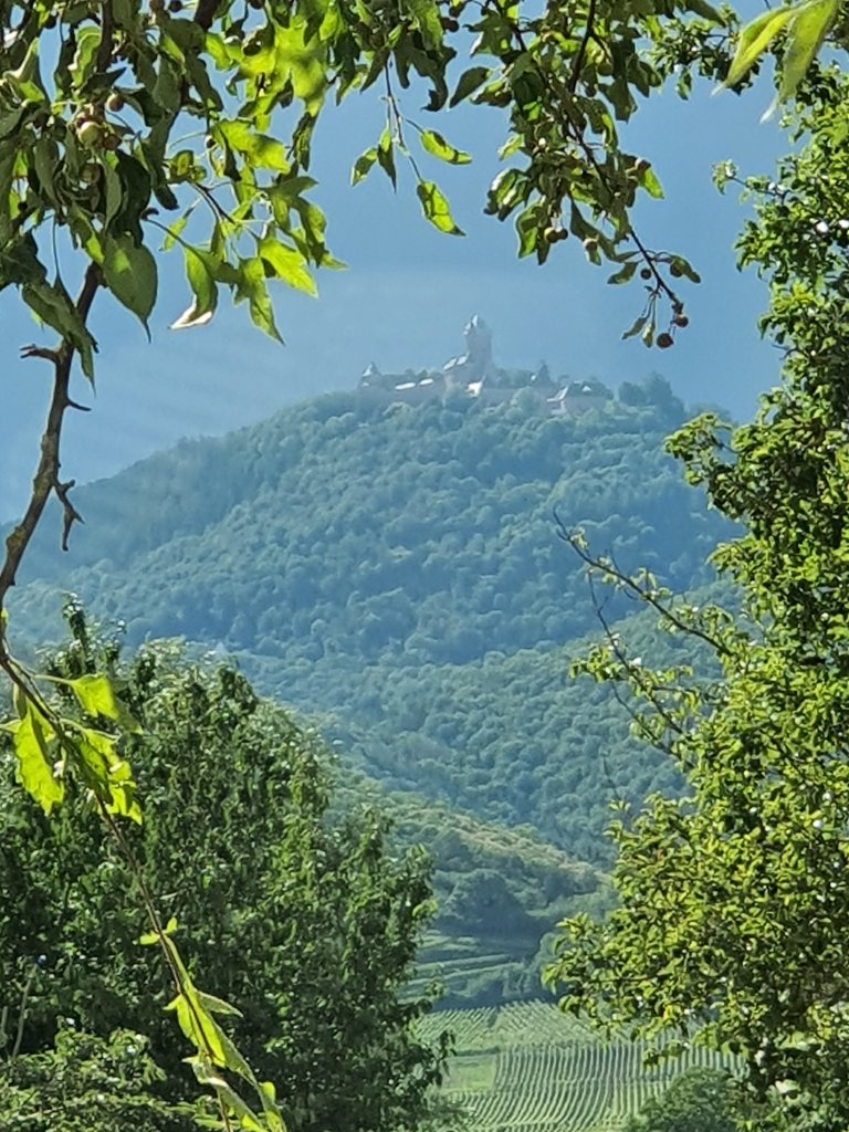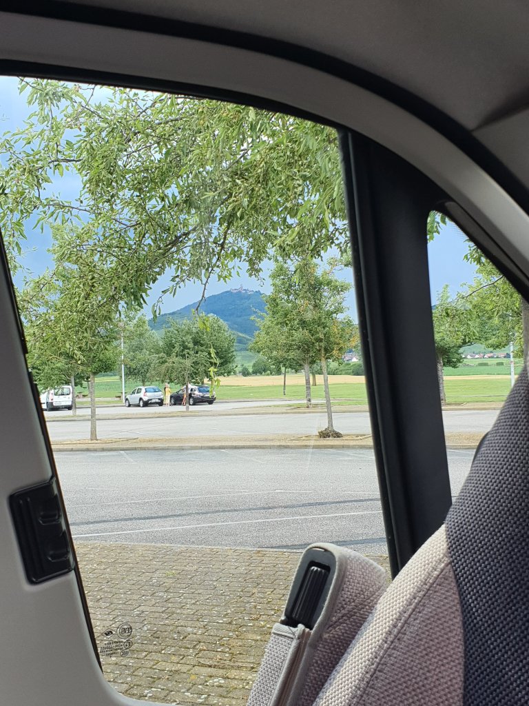 Today we are back in France. The campground resort near Strasbourg is reopening tomorrow and I have booked us in for a week. After that some of the campgrounds up in the mountains are supposed to open so we will try them out. But tonight we are at the municipal aire of Orschwiller which is really nice. There are a couple of shops, a clean bathroom, showers, camper sewage services, picnic tables, and it is far enough from the highway that you have to focus to hear it. It is also free, which is nice because Camping Strasbourg costs almost as much as an American campground would. Are you wondering why I started this blog with a picture of my window? Let me zoom in a little:
